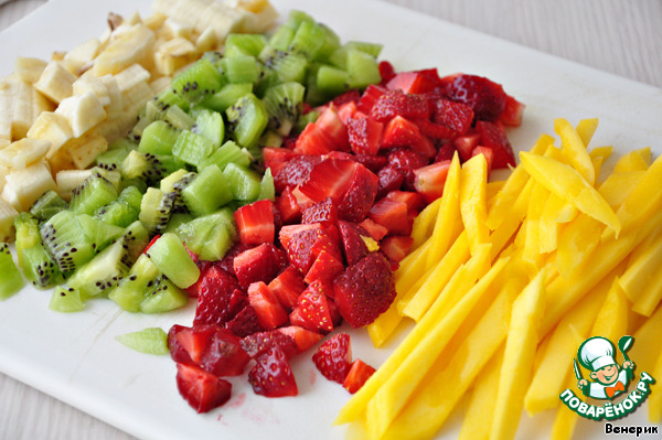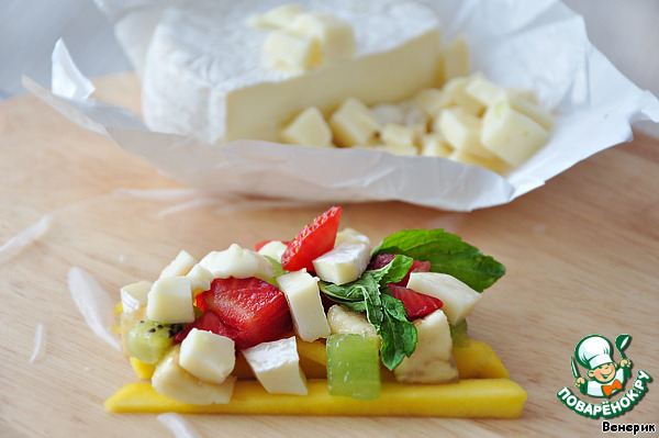 Манго почистить, нарезать брусочками. Остальные фрукты и сыр «Бри» – кубиками.