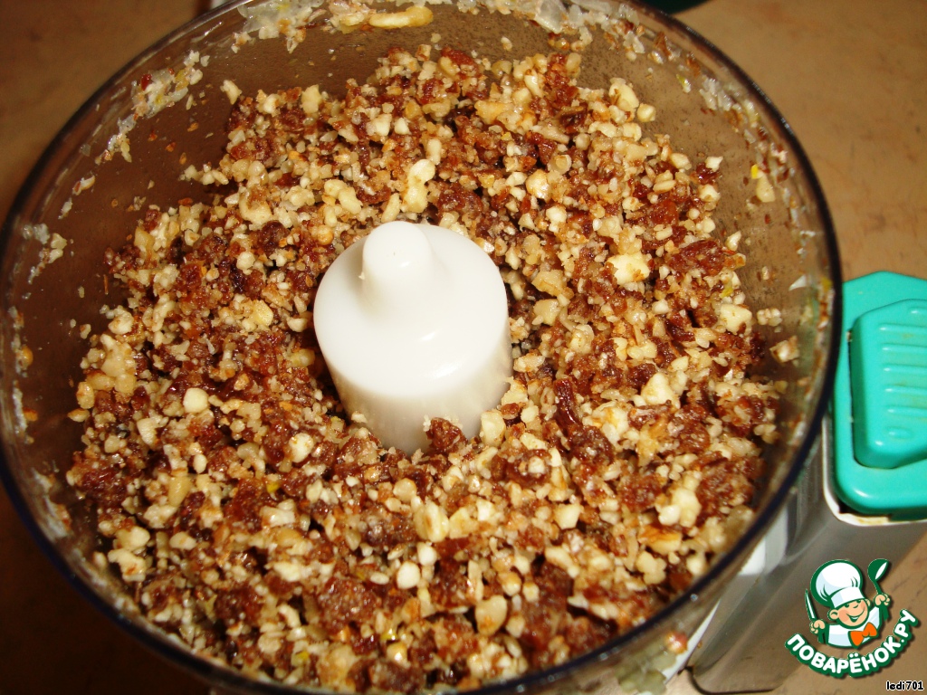 В комбайн складываем все остальные ингредиенты (чернослив, курагу, изюм, лимон) и все перемалываем.