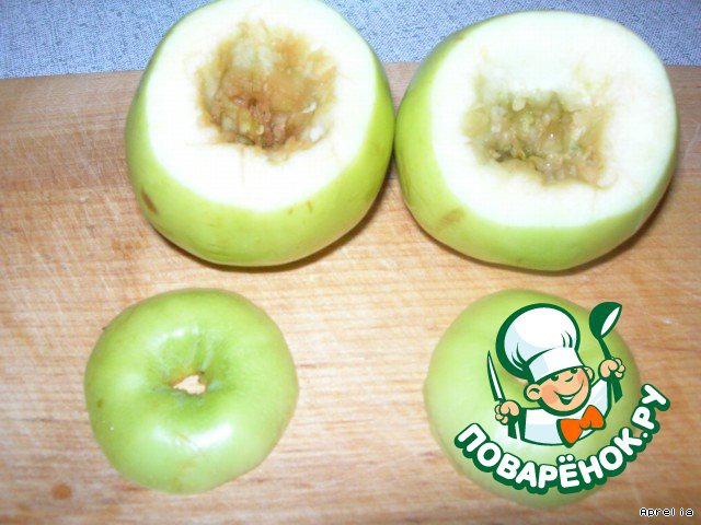 Срезаем с них верхушку и вынимаем аккуратно огрызки (не прорезая яблоки насквозь)