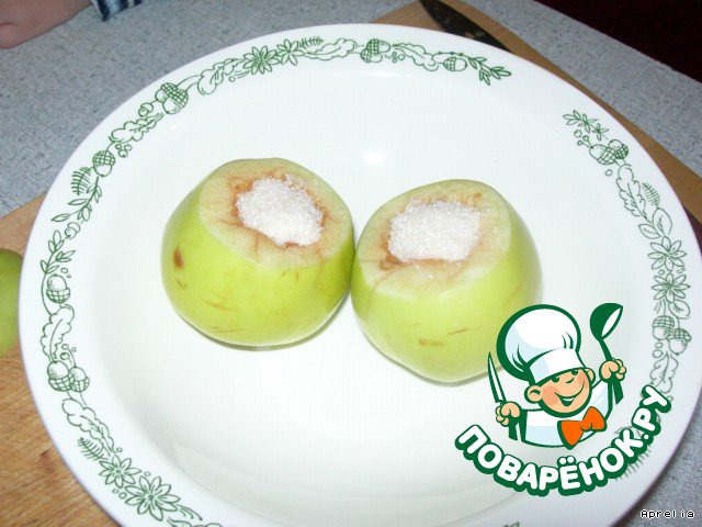 Насыпаем в серединки сах. песок (у меня ушло по 1,5 ч.л. в каждое яблочко)