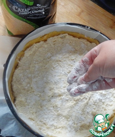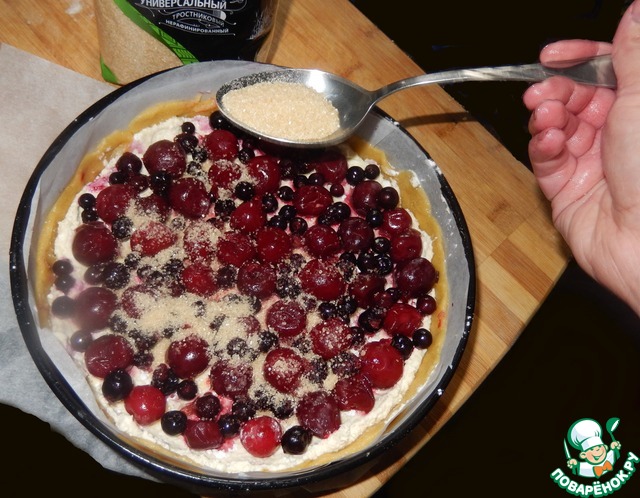 Духовку включаем на разогрев на 200гр. Творожную смесь припорашиваем крахмалом. Он впитает сок от ягод.