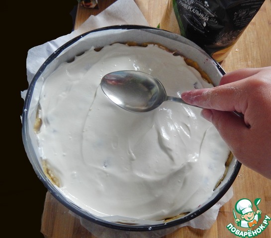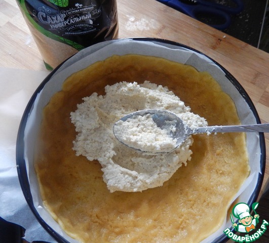 В форму 22см. выстеленную пергаментом выкладываем тесто и распределяем его тонким слоем по дну и бортикам. Выкладываем творожную смесь.