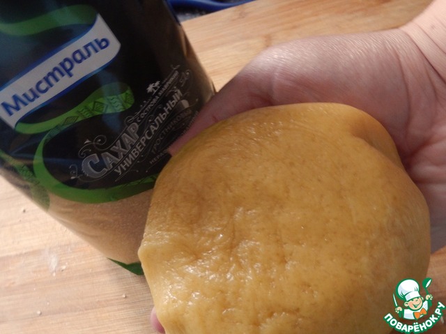 Добавляем яйцо вымешиваем тесто, оно должно быть мягким и не липнуть к рукам. Если нужно добавляем еще немного муки, многое зависит от ее качества и от размера яйца. Тесто заворачиваем в пленку и убираем в холодильник.