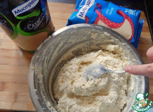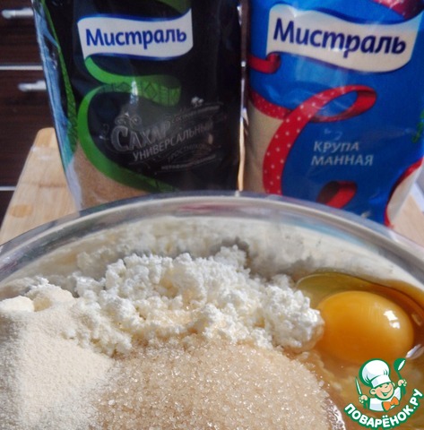 Творог смешиваем с 2,5 ст. л сахара, манкой, ванильным сахаром, солью и яйцом.