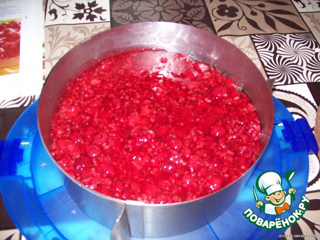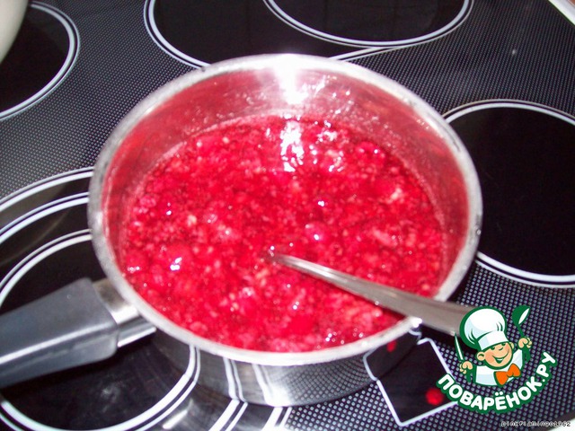 Для прослойки взять 250 мл малинового сока (или воды, как в моём случае), вливаем сок в маленькую кастрюльку, всыпаем сахар и порошок для заливки тортов (или 1 ложку крахмала) и, помешивая, доводим до кипения, снимаем с огня и всыпаем малину (если мёрзлая, предварительно разморозить), осторожно перемешиваем.