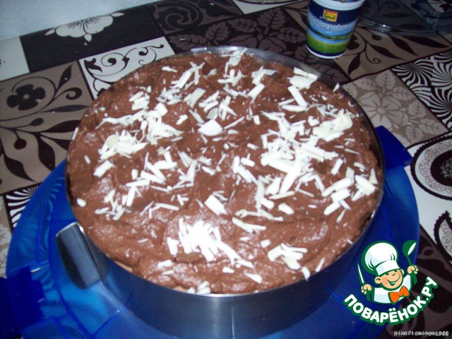 Массу сразу выливаем на нижний корж и накрываем вторым коржом, осторожно прижимаем его и оставляем минут 30 остывать.