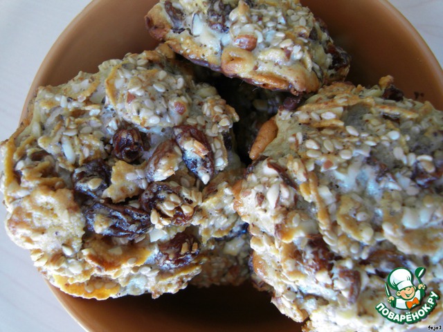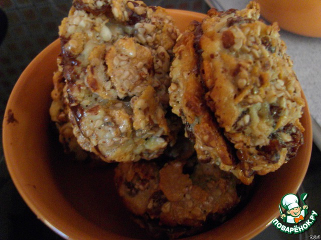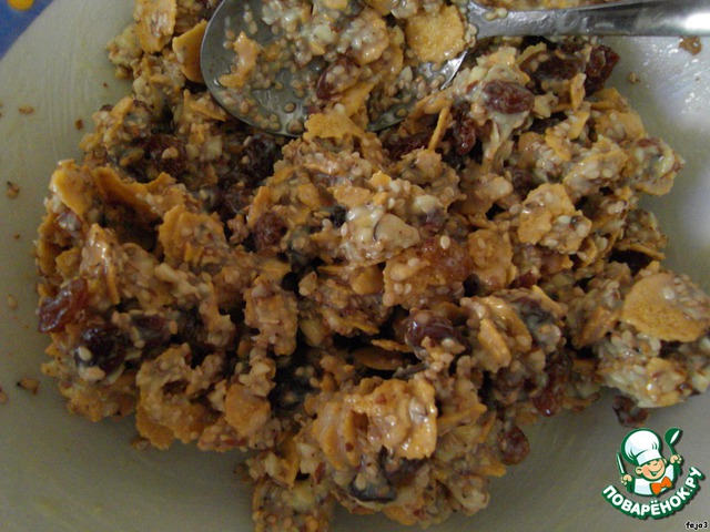 Хорошо перемешать кукурузные хлопья, миндаль, изюм, кунжут