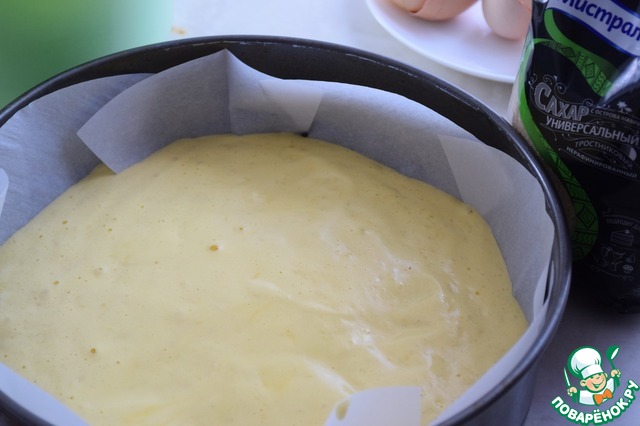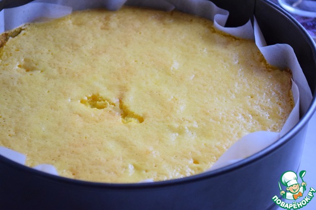 Форму (диаметр 26 см) застелить пергаментной бумагой и смазать растительным маслом. Выливаем бисквит и выпекаем в предварительно разогретой до 180°С духовке 20 мин. Духовку отключаем и оставляем в ней бисквит на 20 мин. Затем бисквит остужаем до комнатной температуры.