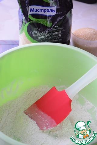 Небольшими порциями добавляем сухую смесь и аккуратно (!!!) перемешиваем.