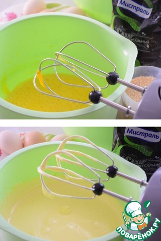 Яйца взбить миксером на большой скорости 1 минуту. Добавить сахар (я использовала сахар тростниковый ТМ "Мистраль") и взбивать на большой скорости 7-8 минут. Должна получится кремовая, однородная масса.