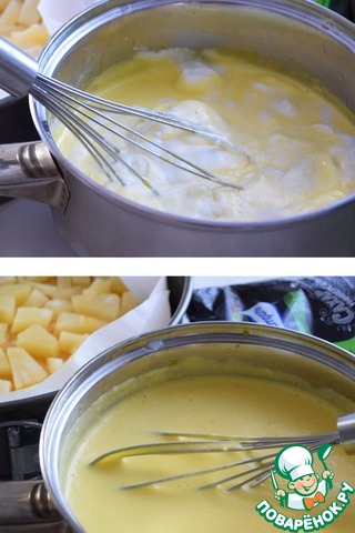 | Очень нежный, очень ароматный торт. Наинежнейший бисквит с очень нежным суфле из сыра "Гауда" на прослойке из консервированных ананасов. Угощайтесь! |
