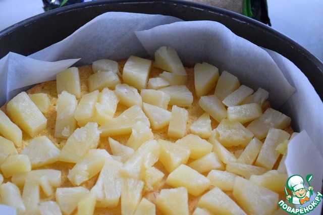 На остывший бисквит выкладываем кусочки консервированных ананасов.