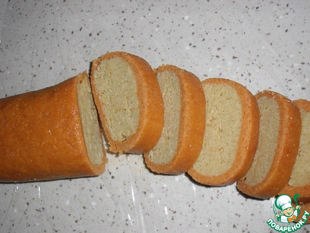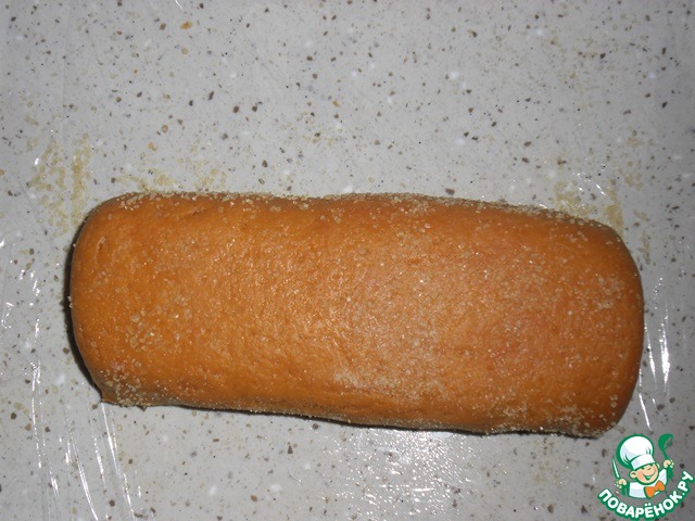 На пищевую плёнку насыпать оставшийся сахар, прокатать колбаску, обернуть в плёнку, убрать в холодильник на час.
