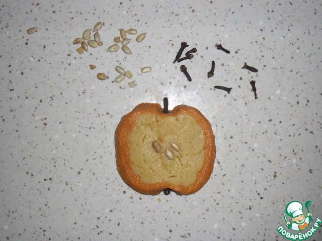 Кружочки немного приплюснуть ладошкой, сделать пальцами небольшие углубления с двух сторон, имитируя яблоко. Воткнуть гвоздику, в середину - семечки, немного вдавив в тесто. Выпекать при 180 гр. 20-25 мин.