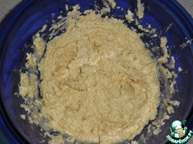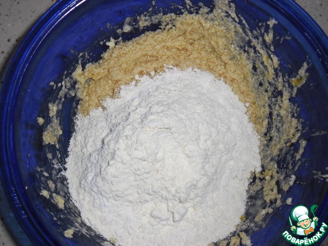 350г муки просеять с разрыхлителем, замесить мягкое тесто.