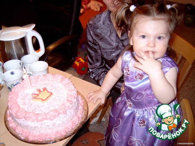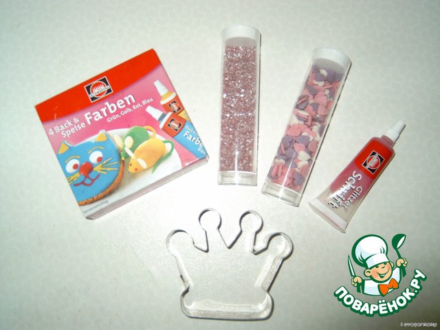 Корона сделана из печенья вот по этому рецептику http://www.povarenok .ru/recipes/show/161 96/. Если у вас нет специальной формы для короны, сделайте из картона трафарет и аккуратно вырежьте печеньку ножом.