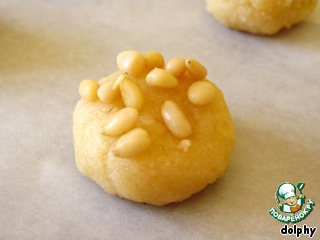 Из чайной ложки теста скатайте шарик, немного расплющьте и обмакните в кедровые орешки.