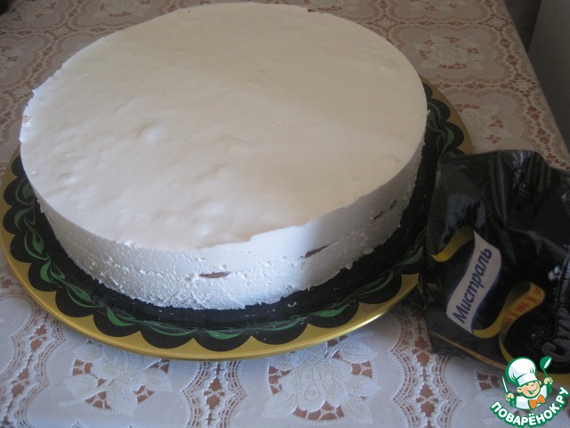 На него половину крема, затем второй корж, на него другую половину крема, разровнять поверхность и убрать в холодильник на 2-3 часа.