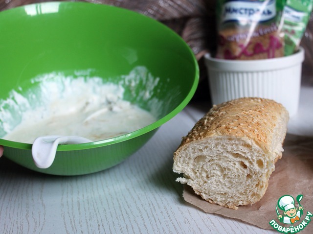 Итак, багет нужно нарезать на 2 части, по размеру формочек, в которых будете потом гренки запекать. В каждом кусочке сделать еще по два надреза, но не до конца, чтобы получилась как бы гармошка.