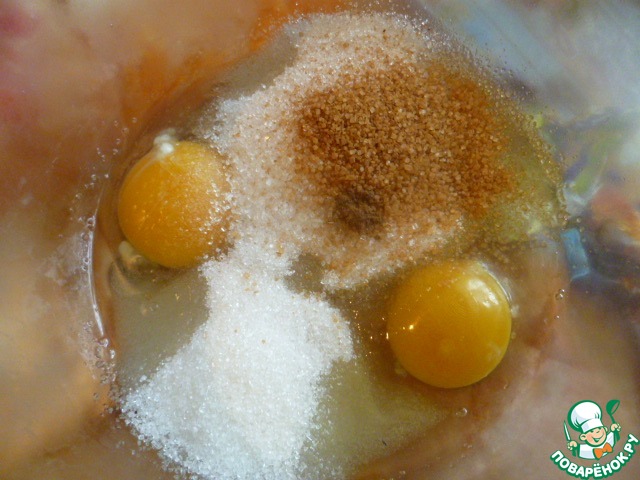 В миску или кастрюлю вбить два яйца, добавить сахар, ванилин и корицу. Хорошо взбить.