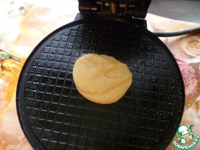 Вафельницу разогреть. У меня 5 уровней разогрева, а эти вафли я пеку на 3. Смазать с помощью кисточки растительным маслом. Выкладываем на середину вафельницы 1 полную столовую ложку теста, дать слегка растечься и плотно закрыть.