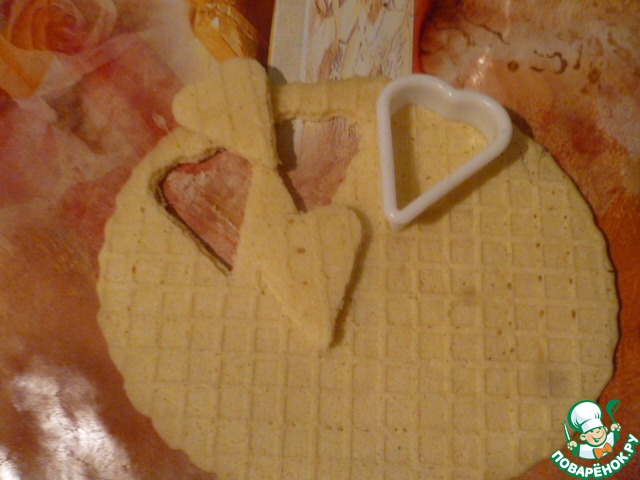 Одну вафлю я оставила для украшения. Формочкой "Сердце" вырезала сердечки. Остатки измельчила в крошку.