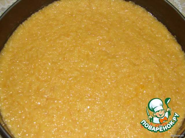 Готовое тесто выложить в смазанную маргарином разъeмную форму. Выпекать при температуре 200 градусов в течение 20 минут.