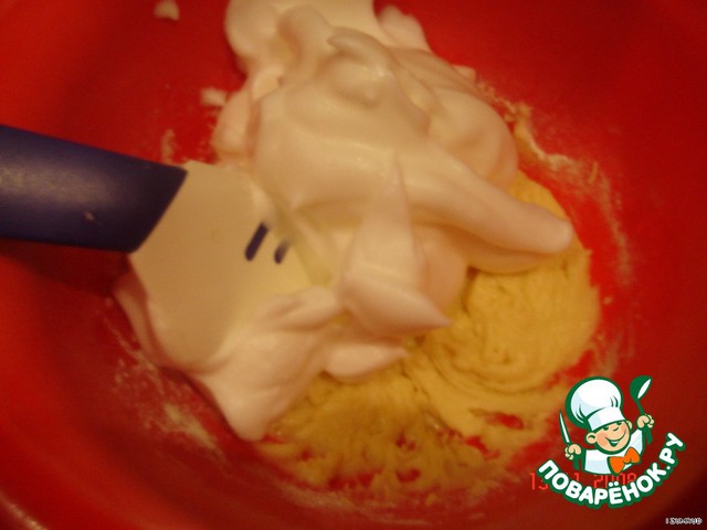 Белки взбить в густую пену с добавлением соли и лимонного сока,