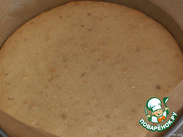 Форму с печеньем по бортикам выложить бумагой (для выпечки), вылить начинку, равномерно распределить.