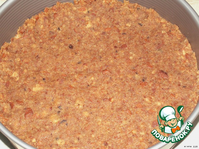 На дно разъeмной формы положить бумагу для выпечки, выложить смесь печенья с маслом, разровнять и утрамбовать руками.
