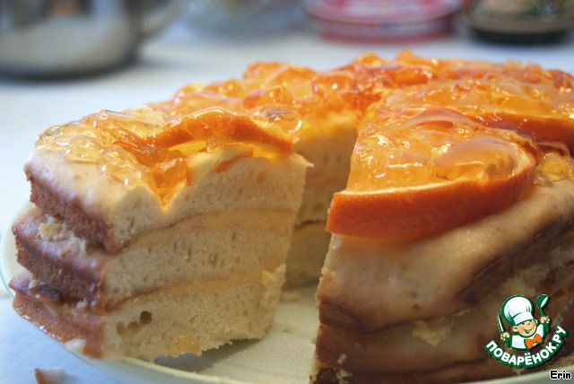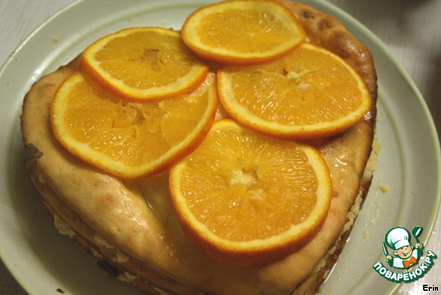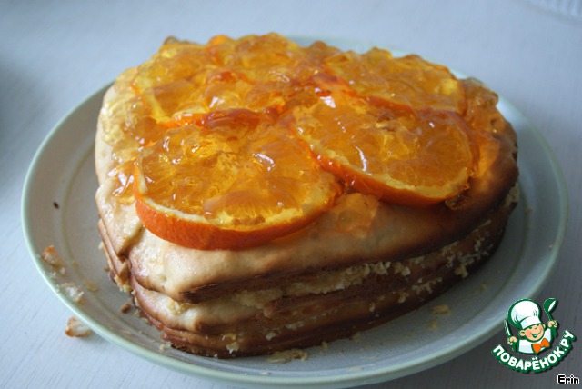 Эти апельсины кладем на верхний корж и поливаем оставшейся жидкостью-сиропом. Ставим торт на холод.