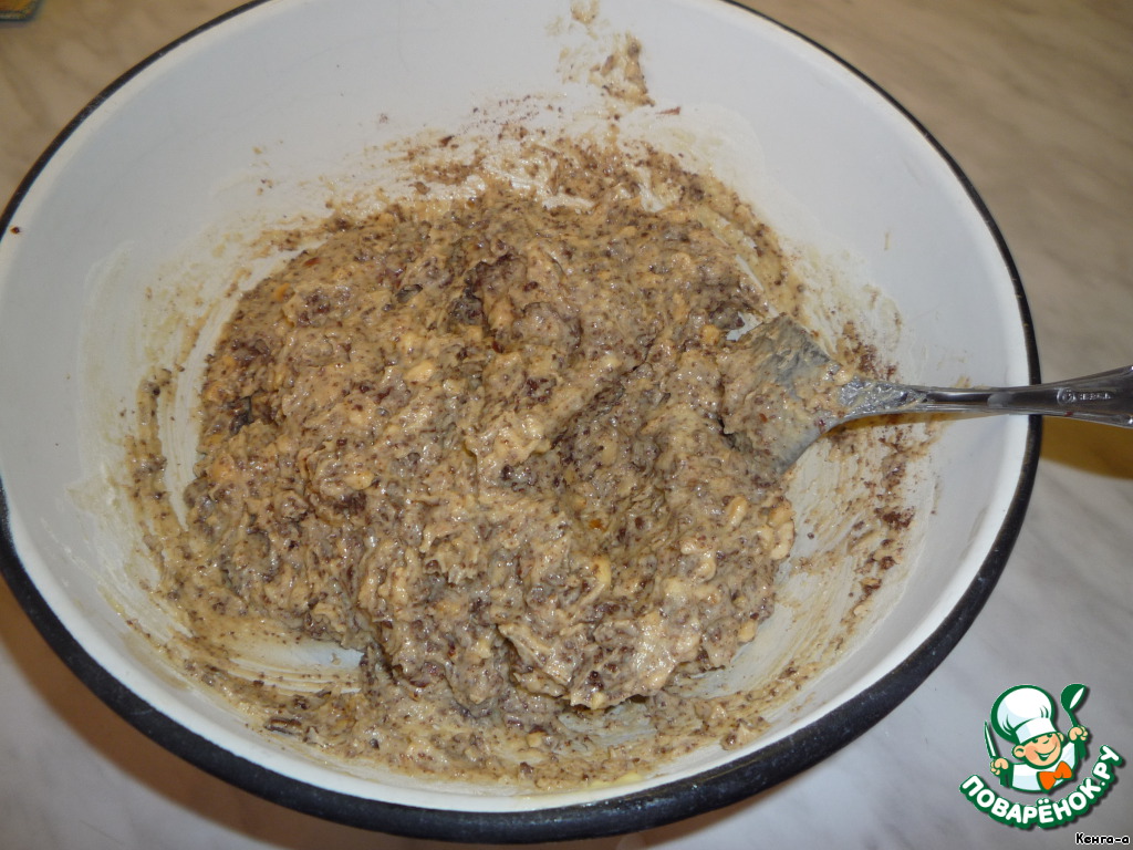 Собственно, сам замес теста у нас займет 5-7 минут. Растираем венчиком масло с сахаром, добавляем яйца и хорошо перемешиваем. Теперь очередь муки и разрыхлителя. Перемешиваем и добавляем орехи с шоколадом. Тесто готово! Оно не крутое, но ложка стоит))