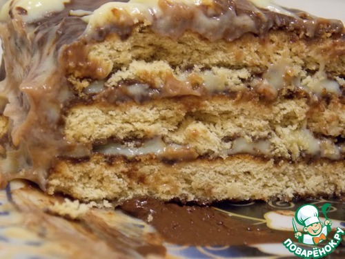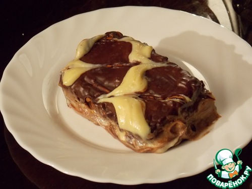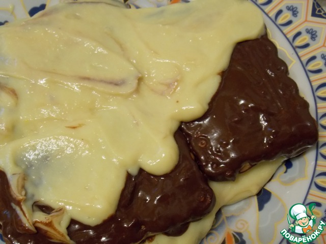 Печенье окунуть в шоколад и положить на блюдо в один слой. С верху кладем часть крема. Затем снова печенье и крем. И так до конца. Убираем в холодильник на 2 - 3 часа, чтобы пропитался.