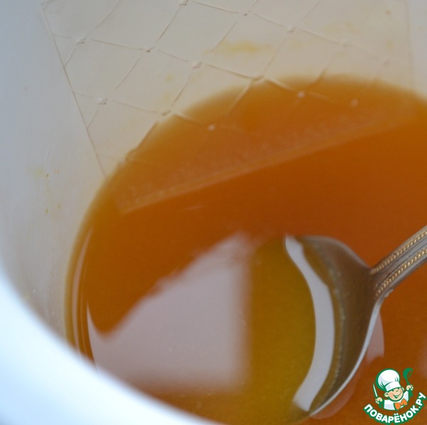 Выложить пищевой пленкой форму (дно и стенки) и вылить первый слой. Убираем его в холод до полного застывания.