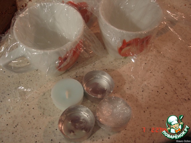 Застелить кружки пищевой пленкой, разобрать свечки и основу тоже обвернуть пленкой (как на фото).