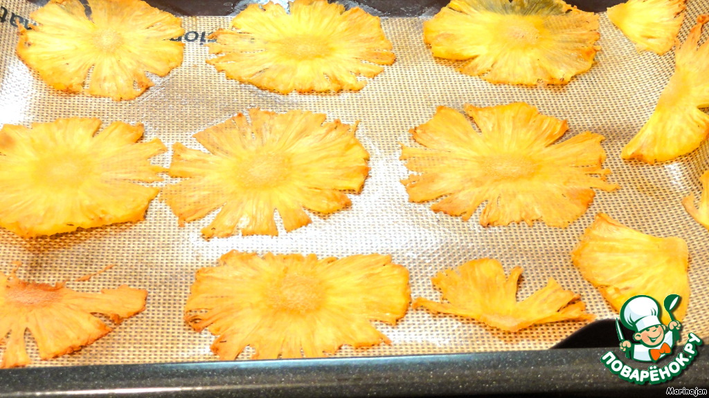 Ананас нарезать на тонкие пласты и поставить в духовку сушиться на 1 час при t 180*С.