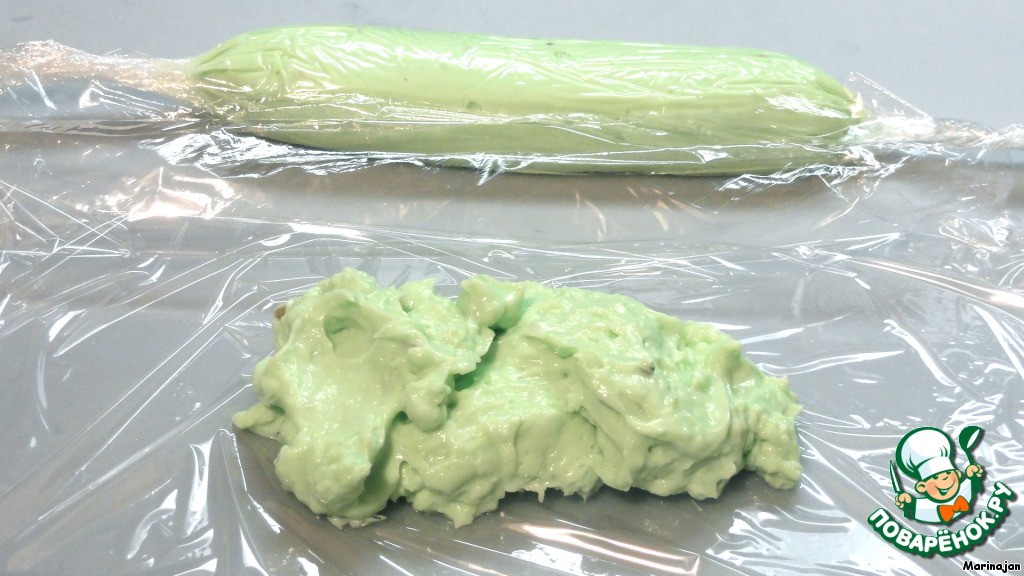 Добавить половину сахара, сливок, распущенного желатина и ванилин. Подкрасить, дать схватиться желатину и перенести на пищевую пленку.