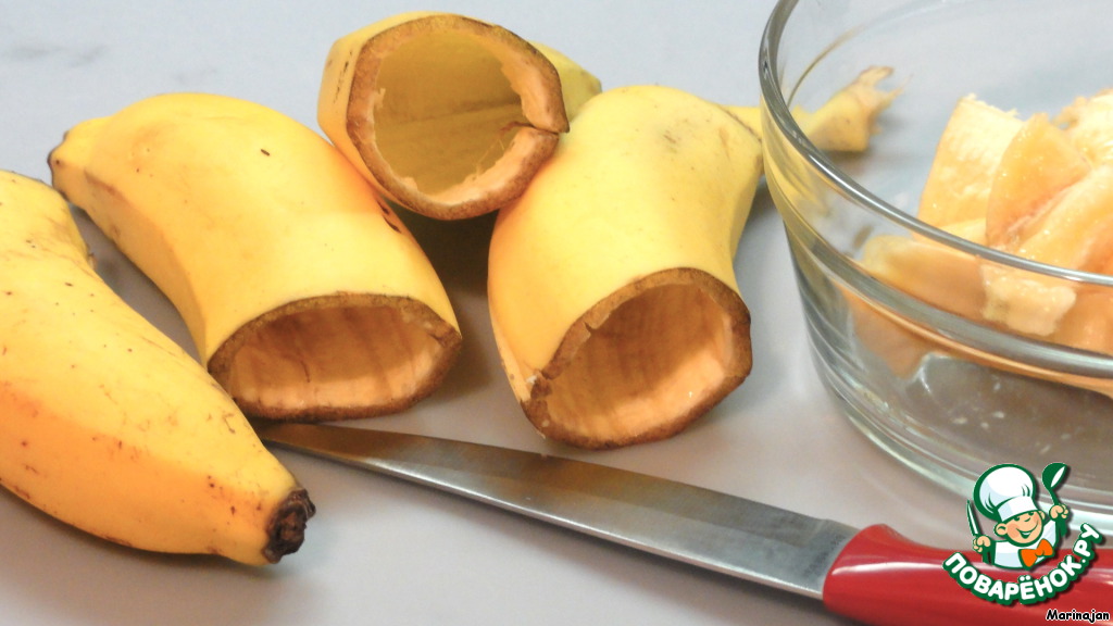 Готовим банановый мусс так же, как ананасовый и заполняем им полости бананов.