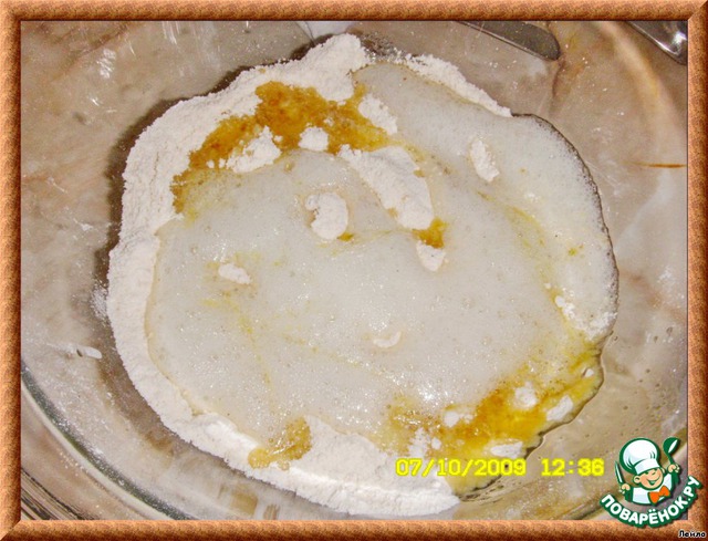 Вылить масло и белки в мучную смесь, быстро перемешать до увлажнения муки.