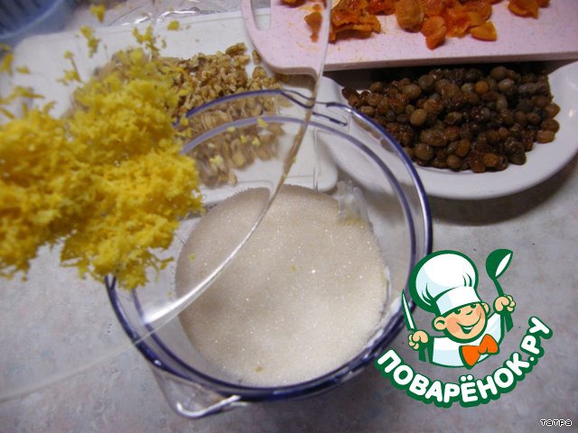 Грецкие орехи рубим, курагу режем на кусочки.