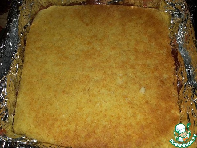 Охлажденный бисквит разрезать на 2 части. Так как у меня форма с невысокими бортиками, я вырезала из картона борты и обернула фольгой. Выложила одну часть бисквита на дно формы, сверху вылила суфле.