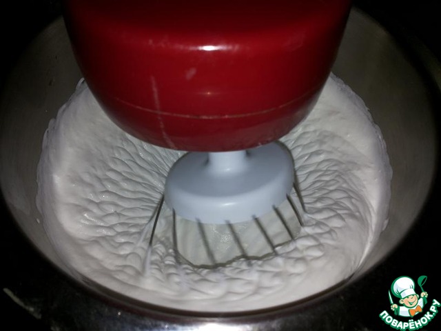 Муку просеять вместе с крахмалом и разрыхлителем и аккуратно, частями, ввести в яичную массу, перемешать. Получится воздушное тесто. Этот процесс можно проделать вручную.