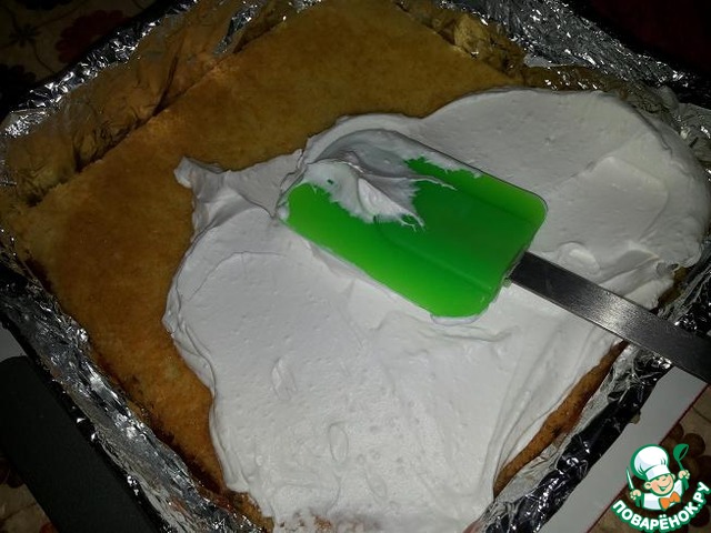 Сливочный крем равномерно распределила по поверхности бисквита.