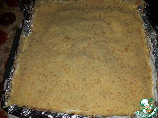 Сверху посыпала бисквитной крошкой и поставила в холодильник для застывания на ночь. Кто торопится - можно на 3-4 часа.