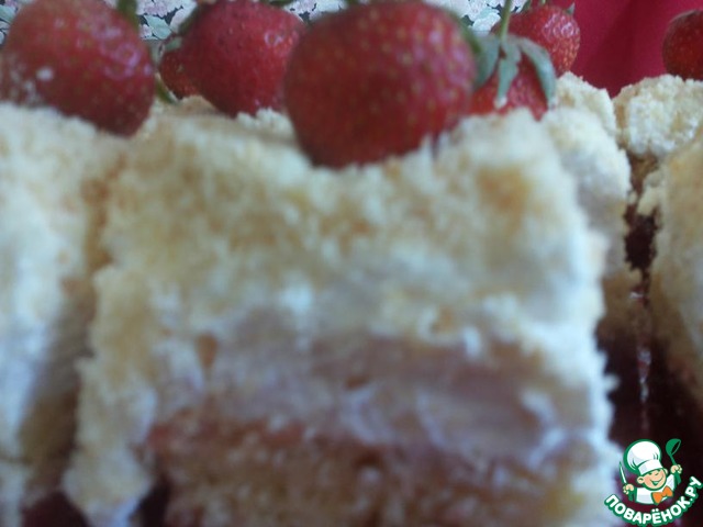 Утром готовый пляцок разделила на 16 частей и украсила свежей клубникой. Жаль, что не было листочков мяты- было бы очень красиво...