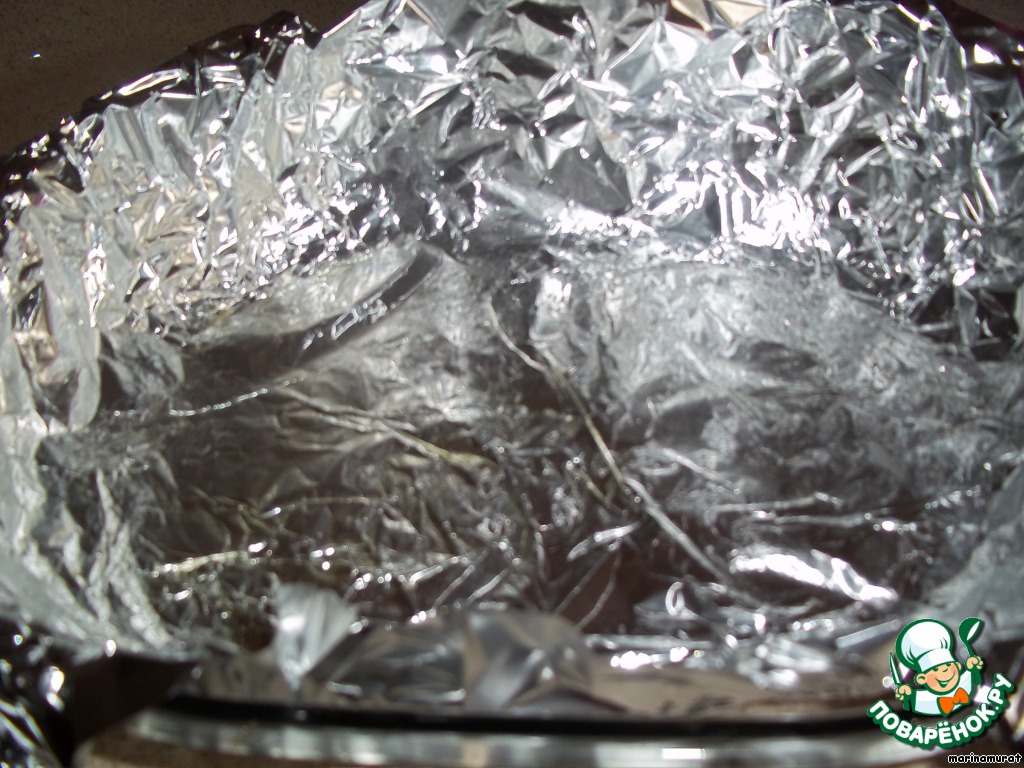 Выстилаем форму фольгой и смазываем немного маслом (у меня оливковое).