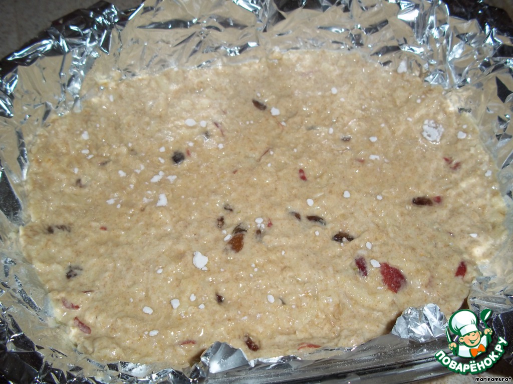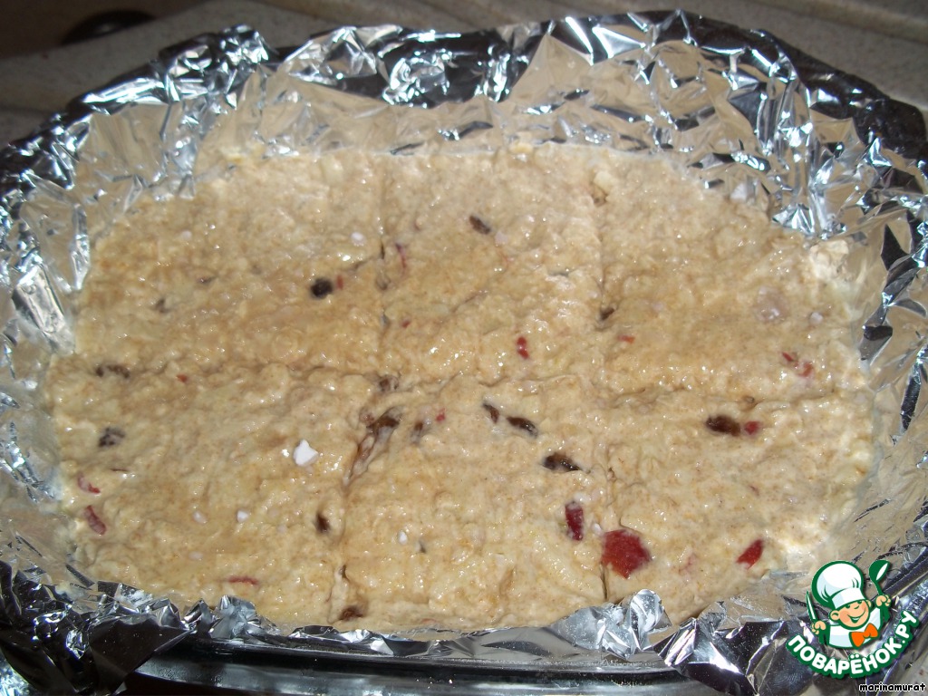 ...разделить ножом на квадраты и поставить в разогретую до 160 градусов духовку на 40 минут, затем еще 10 минут при 200 гр. для корочки. Время запекания зависит от толщины слоя - чем тоньше, тем быстрее.