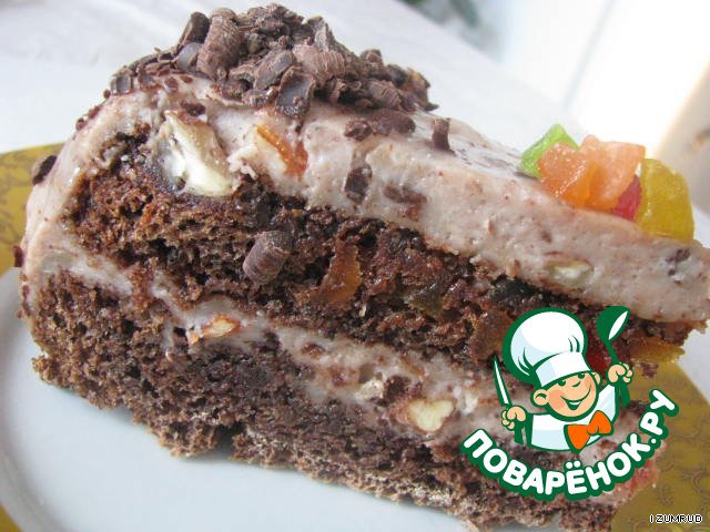 в отдельную посуду всыпать цукаты(немного оставить для украшения)+1 плитка шоколада натёртый на крупной тёрке+какао