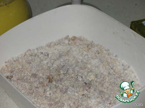 В отдельной чашке смешать ореховую крошку (я измельчила грецкие орехи в процессоре), муку и сахар.