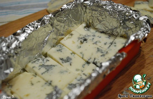 Форму выложить фольгой, на дно положить половину сырных полосок,